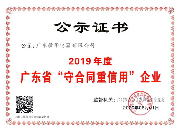 点赞!敏华连续四年被评为广东省“守合同重信用”企业!